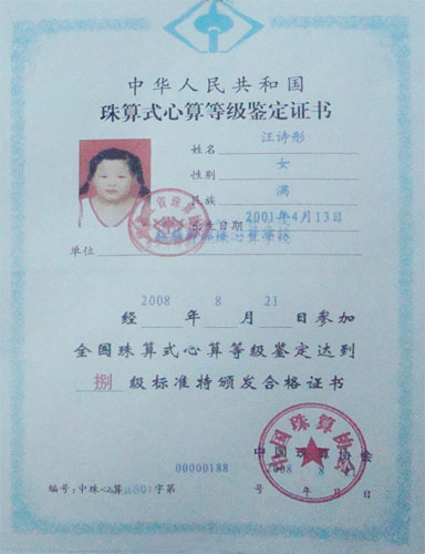 汪诗彤珠算式算等级鉴定证书-大庆超越智能珠心算_大庆智能珠心算_大庆珠心算_超越珠心算_珠心算_大庆少儿学校_大庆算数_大庆幼儿教育